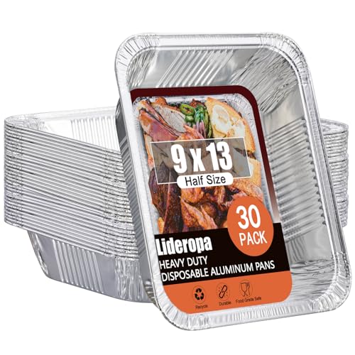 The Aluminum Pans Half Size, 9X13, Extra Heavy Duty Disposable Foil Pans are a versatile and convenient solution for all your baking, roasting, and food prepping needs. Made from premium quality thick aluminum with reinforced walls, these pans provide a sturdy composition that ensures superior heat conductivity for even baking and roasting. Eco-friendly and safe, they are fully recyclable and designed for a mess-free dinner experiencejust toss them after use or wash them in the dishwasher. Ideal for parties, BBQs, and catered events, these pans can serve as steam table trays or simply as stylish serving dishes. Whether baking brownies, lasagna, or perfecting side dishes, this multi-purpose set is perfect for any kitchen task. With a satisfaction guarantee, you can trust in the quality and functionality of this 30-pack set from Nicole Home Collection.