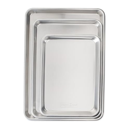 The Nordic Ware Naturals 3 Piece Set is expertly crafted from pure aluminum, offering superior heat conductivity for perfectly baked goods. This commercial-quality bakeware includes a Quarter Sheet, Jelly Roll, and Half Sheet Pan, catering to all your baking and cooking needsfrom cookies and sweet treats to savory sheet pan meals. Designed to last a lifetime, these pans feature encapsulated galvanized steel rims that prevent warping, ensuring they maintain their shape and quality through countless uses. Proudly made in the USA, this durable bakeware set promises longevity and performance in your kitchen.
